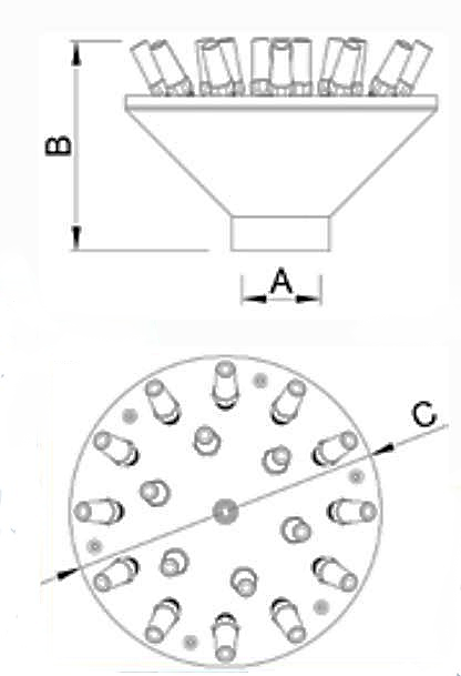 Эта насадка комбинирует разные углы наклона выходных отверстий, в результате чего создаются параболические струи различной высоты. Эта модель оснащена распределителем потока. Благодаря этому формируется водная картина по форме напоминающая корону.