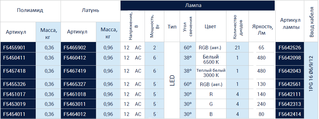 Подводный светильник Dichroic lightfixture, 1 диод, 38°, 12V.AC, 6W, LED теплый свет